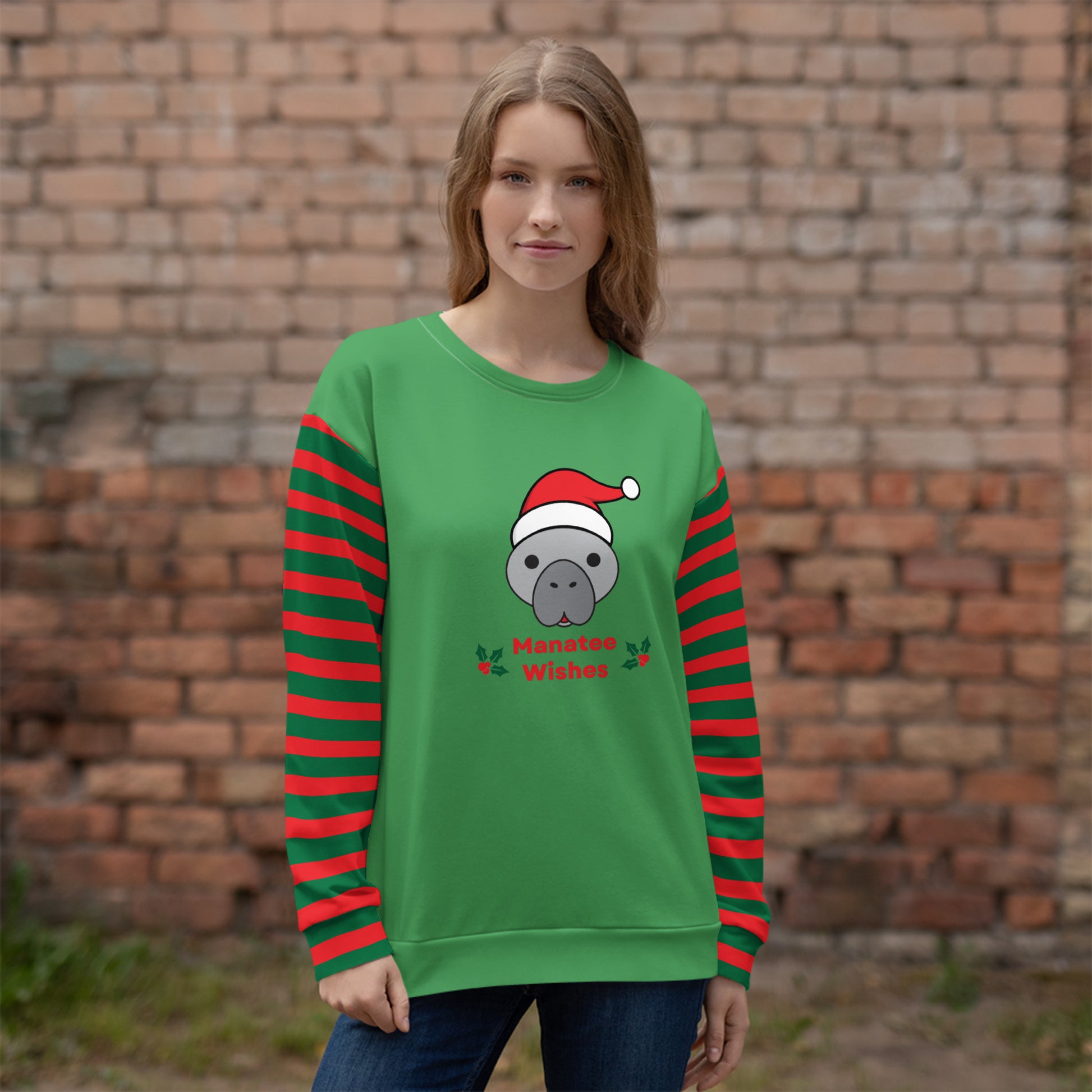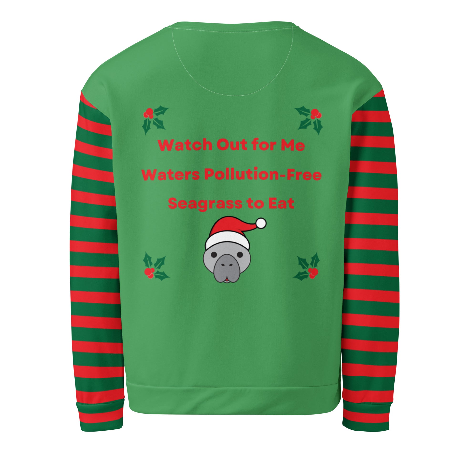 Spread Holiday cheer in this custom all over print Christmas manatee unisex graphic sweatshirt! Featuring a front and back manatee themed graphic print with a festive Holiday print on both sleeves, this comfy crewneck sweatshirt raises awareness for manatee protection and conservation. Help spread this important message throughout the Holidays. Makes a great Holiday gift for the manatee lover in your life!