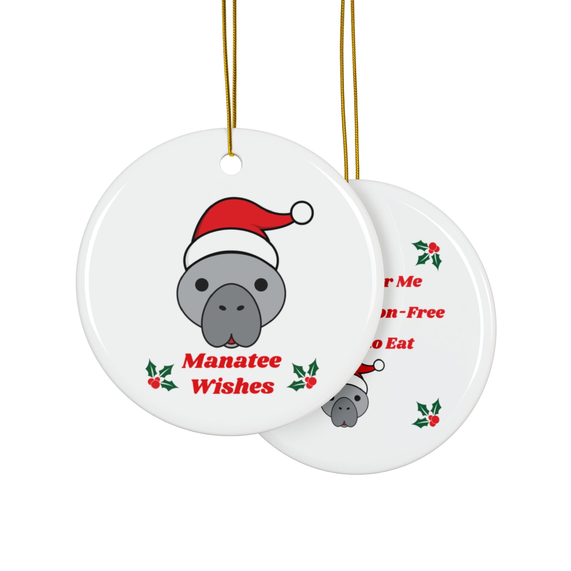 Ring in the Holidays and get in the Christmas spirit with this cute manatee Christmas ceramic ornament! Promoting a message of protection and conservation, this manatee ornament conveys what every Manatee wishes for! This cute manatee Holiday ceramic ornament features a two-sided print; the front graphic features a manatee in a Santa hat, and the back graphic features three positive messages for their protection and survival. This festive ornament is an important reminder of the steps we can take to protect these gentle Florida sea cows. A great gift for yourself or the manatee lover in your life!