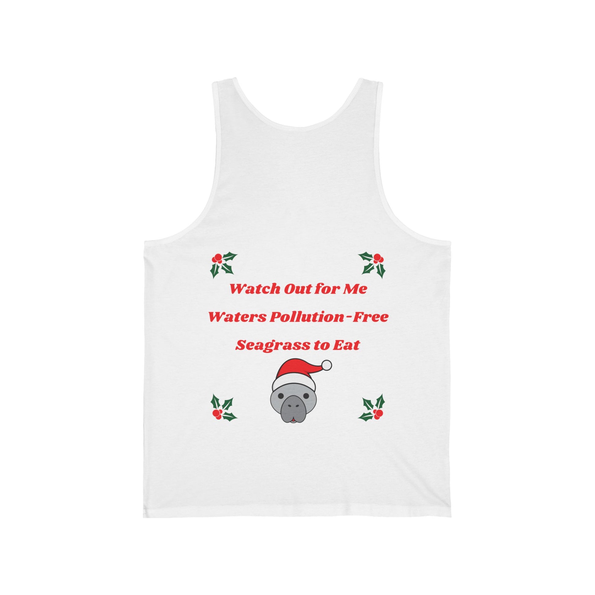 Spread Holiday cheer in this manatee unisex jersey tank top! Featuring a front and back manatee themed graphic print, this tank serves a purpose in raising awareness of what manatees need for their survival. Help spread this important message in this soft, comfy unisex tank top throughout the Holidays. A perfect choice while at the beach, gym, or in warmer weather. Makes a great Holiday gift for the manatee lover in your life!